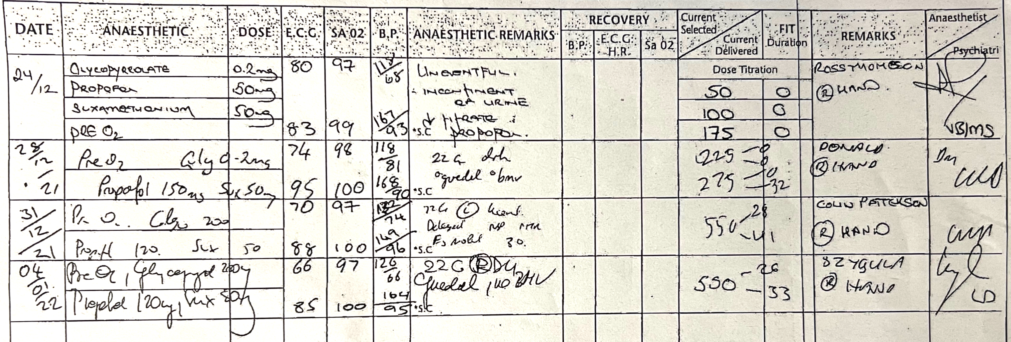 This is the record of my ECT 'treatments'. I will need further advice before I fully understand its meaning, but I see that I pissed myself during the first session. It seems that they gave me Propofol as an anaesthetic and tripled the dose after the first session, Suxamethonium Chloride as a muscle relaxant, and Glycopyrrolate to prevent bradycardia. They failed to make me have a seizure during the first session after three attempts with increasing amounts of current. They had two goes at increased doses during the second session and on the second attempt I had a fit of 32 seconds recoded on the ECG. They then doubled the current for the final two sessions and managed to make me have a seizure each time. They also gave me oxygen throughout the 'treatment' to increase my oxygen saturation.