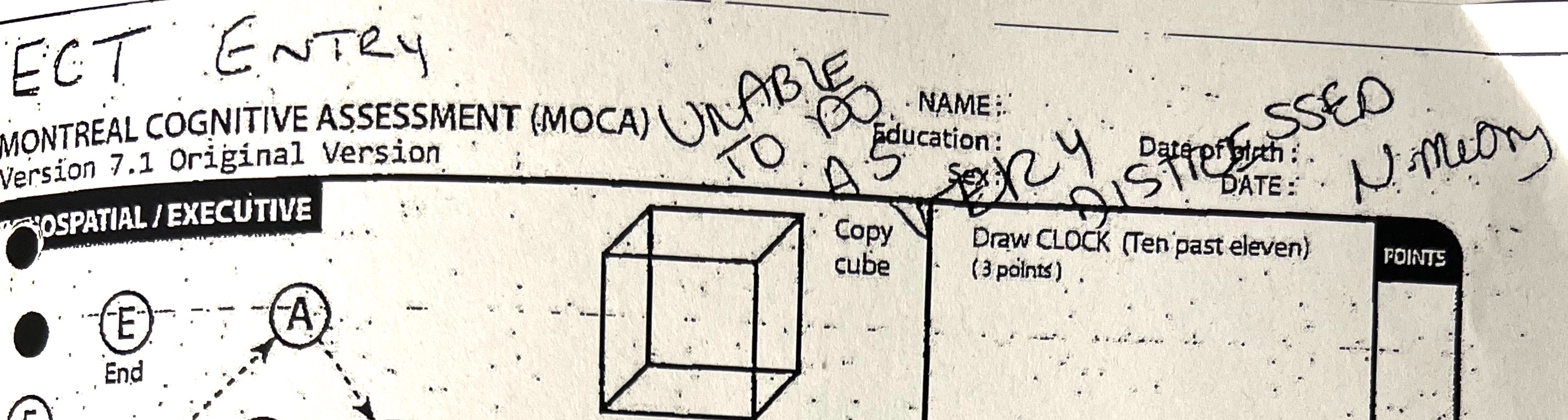 This note is undated but it confirms that I was not just unhappy about being given ECT but that I was extremely distressed by the experience. This is the crude and ridiculous way in which they assessed the cognitive impairment caused by the electrocution and seizures. There was no long-term follow-up, no test for memory loss and certainly no imaging to identify any brain damage.