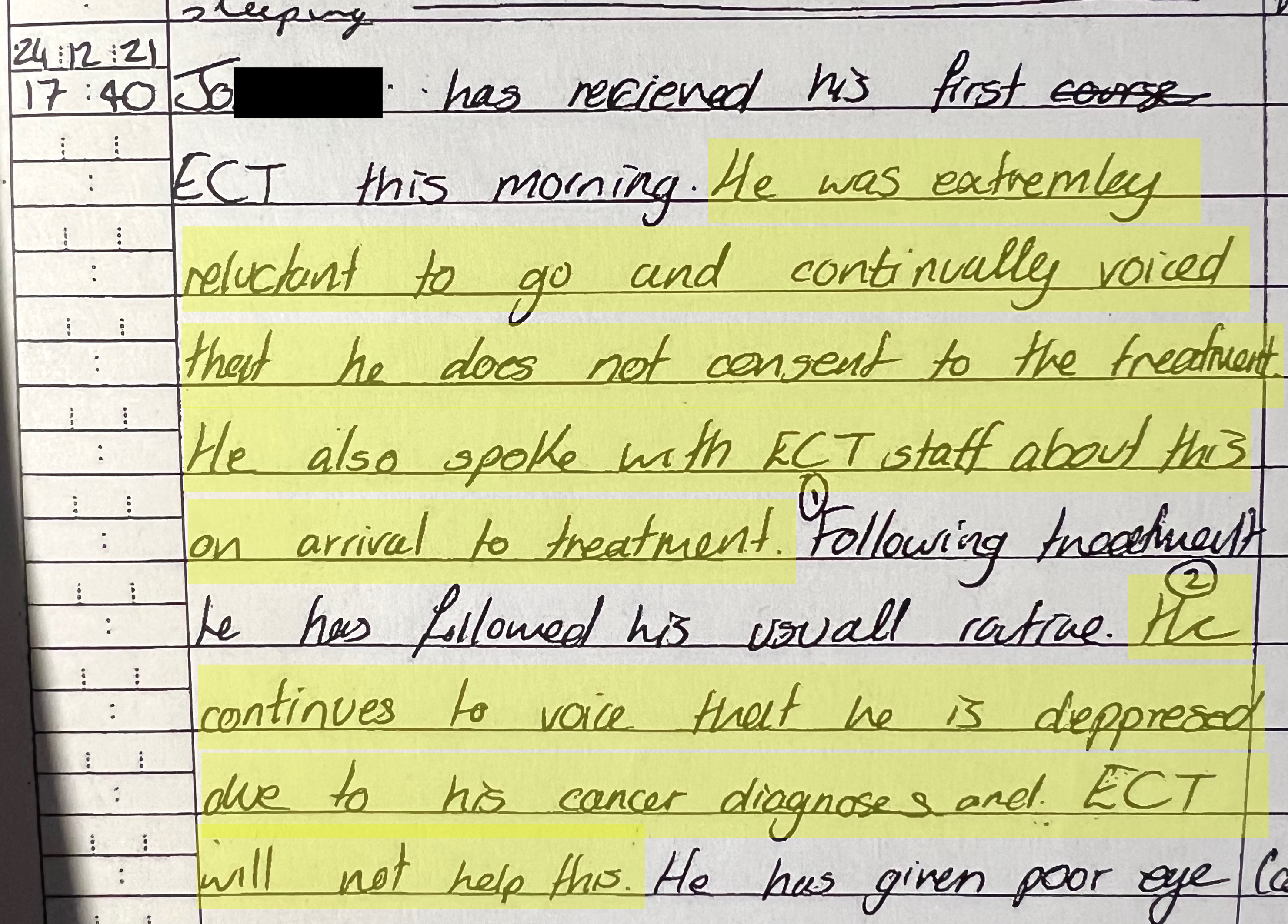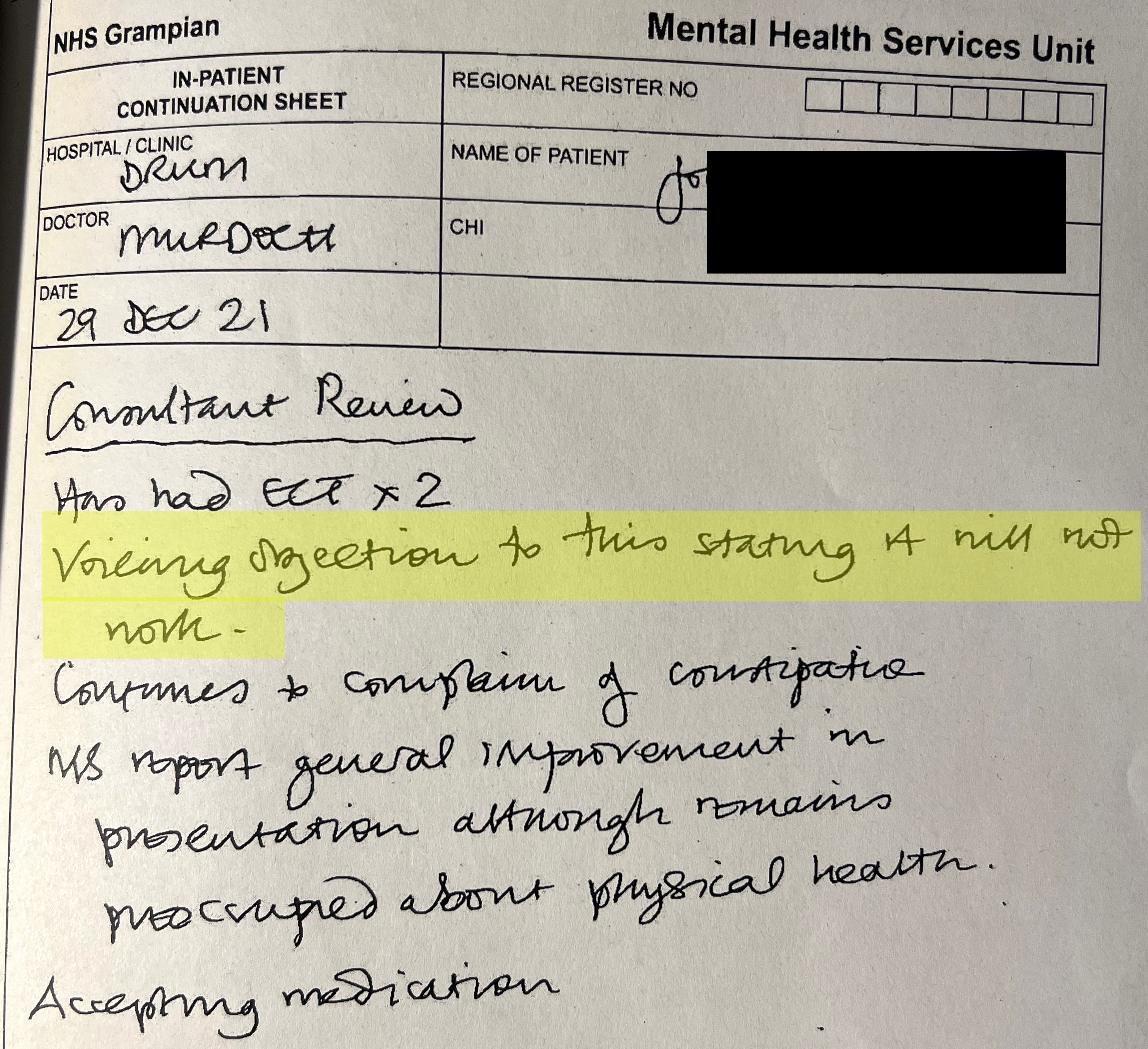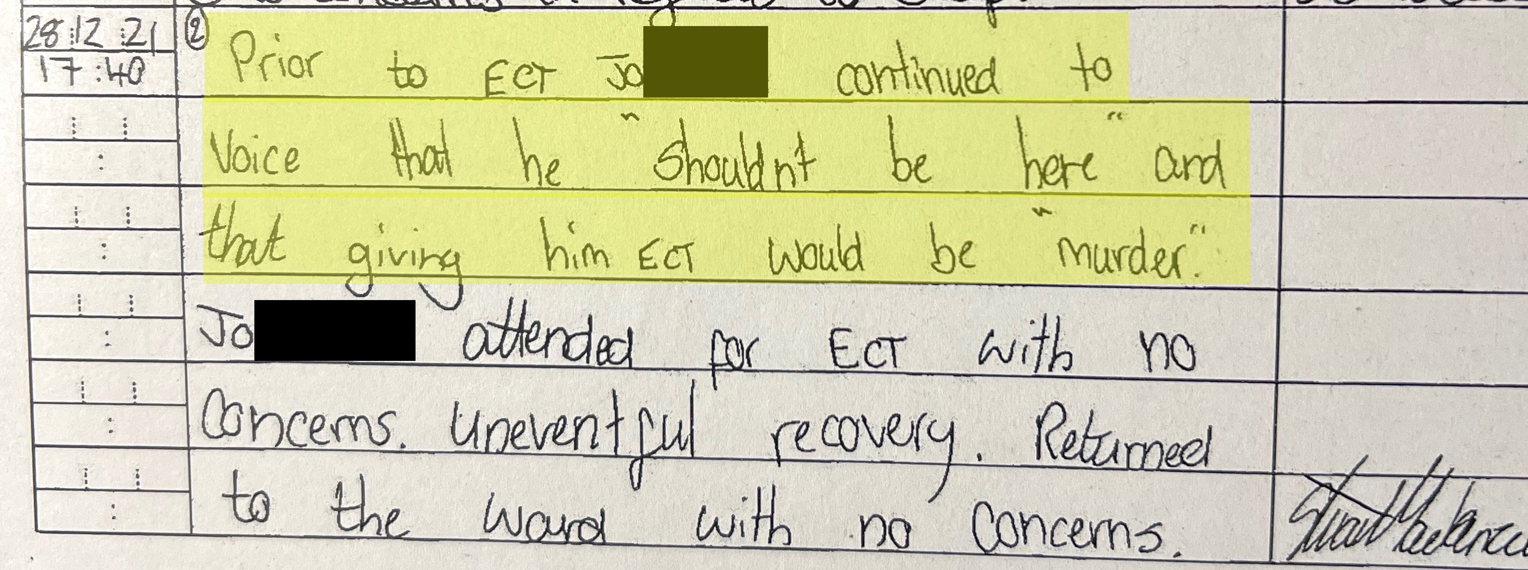 I now have access to my medical notes, which confirm that I did not consent to ECT, that procedures to notify me were not followed, and that three of the four treatments were done after I had became an informal patient and so were done illegally.