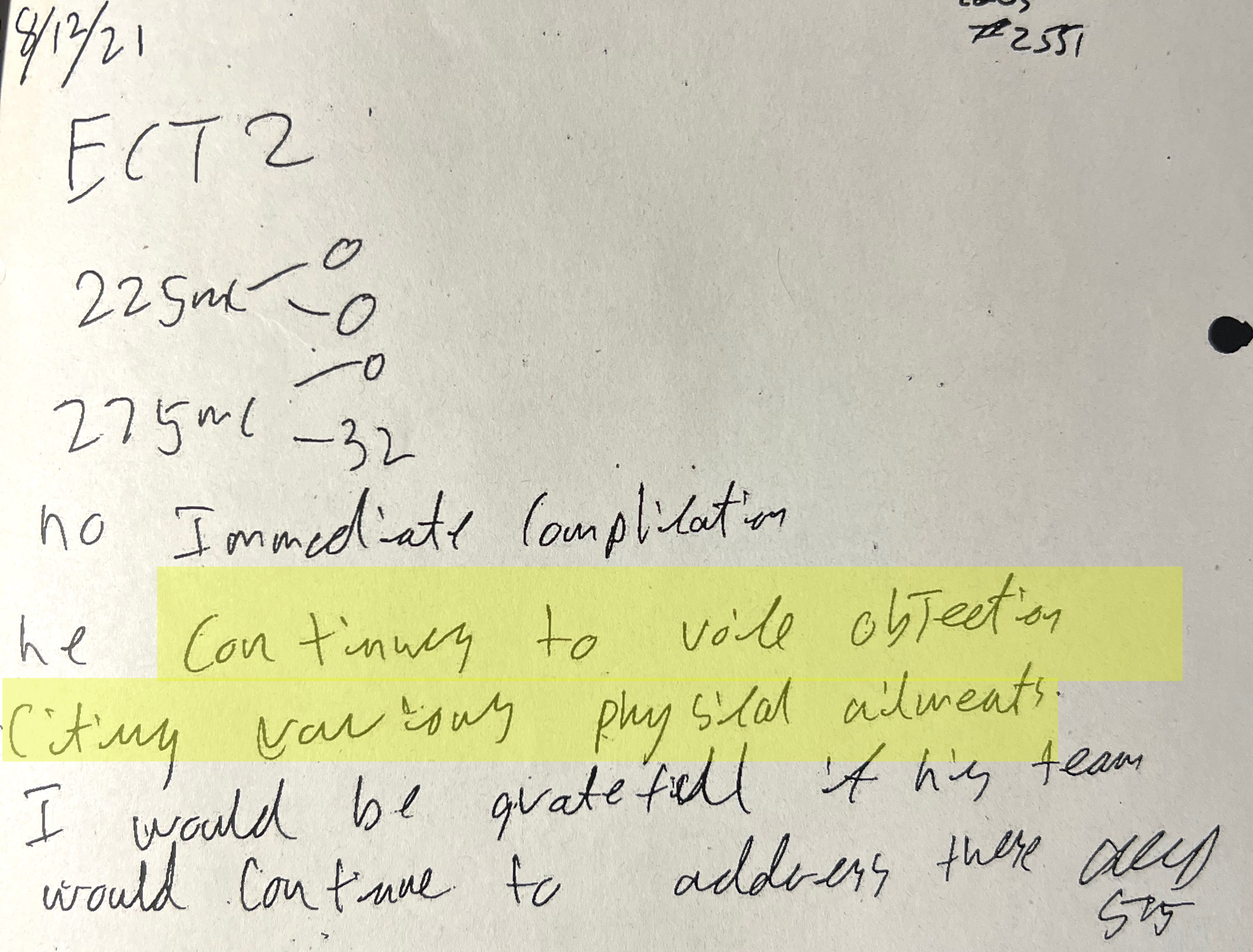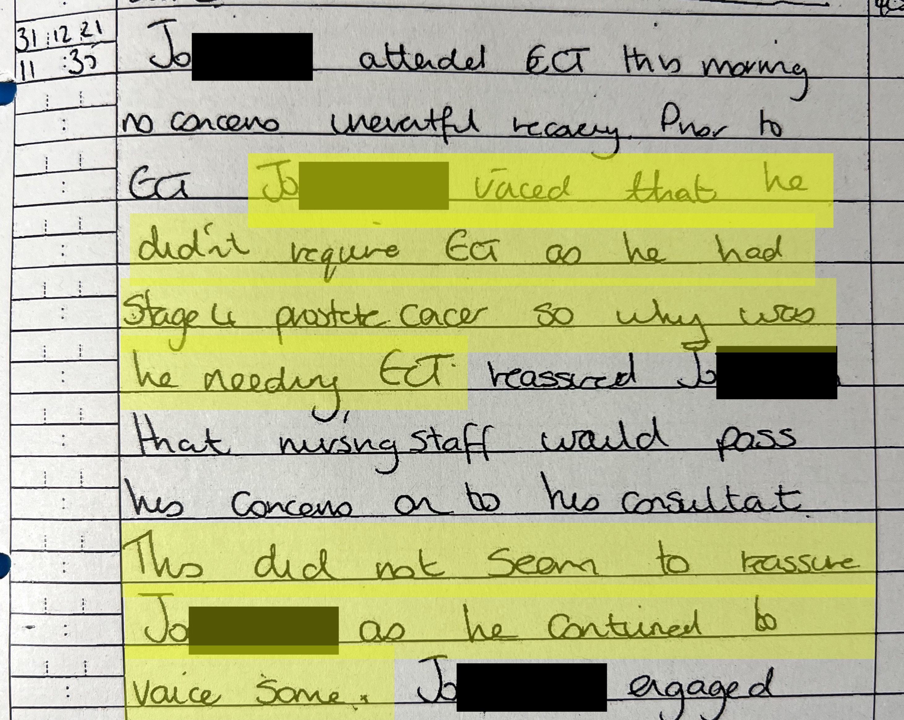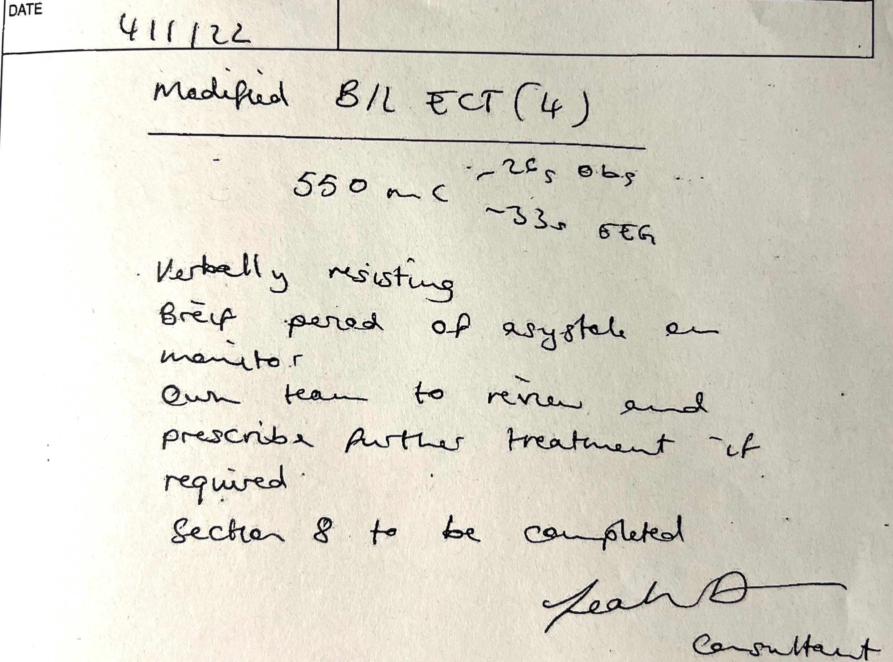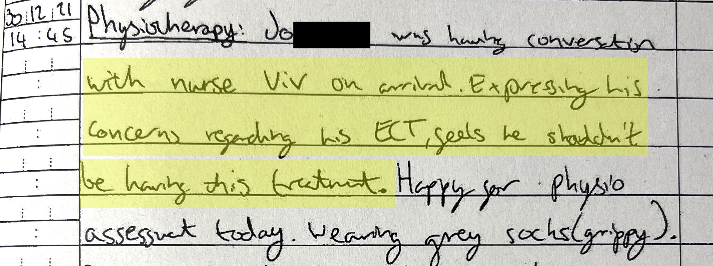 I now have access to my medical notes, which confirm that I did not consent to ECT, that procedures to notify me were not followed, and that three of the four treatments were done after I had became an informal patient and so were done illegally.