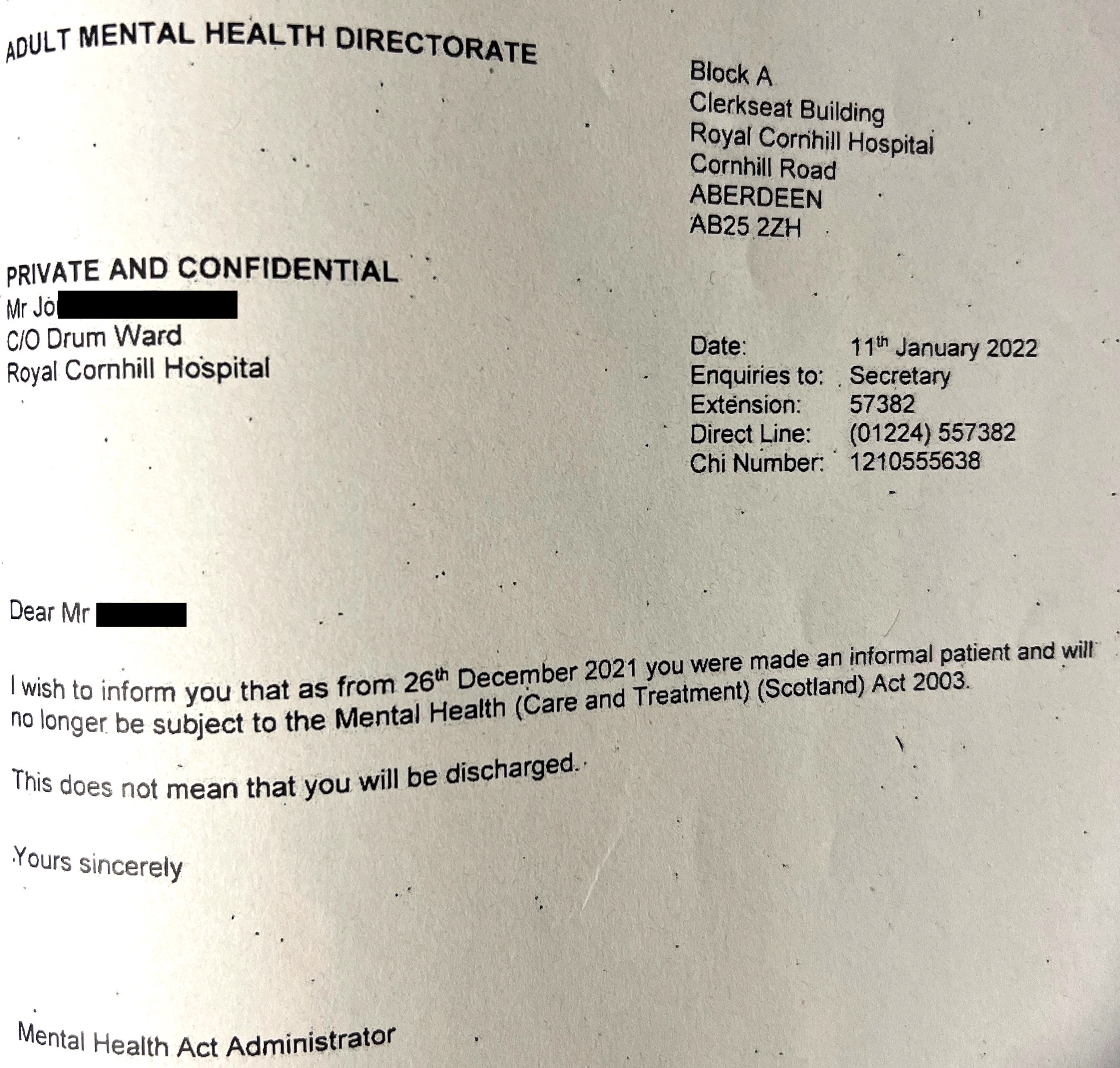 I received this letter informing me that I was an informal patient from 26th December 2021 onwards and so the hospital had no legal power to give me the ECT 'treatments' on 28th and 31st December 2021 and 4th January 2022 when I repeatedly told them that I did not consent. They did not tell me that I was an informal patient and had the right to refuse them, until after they had given the treatments.