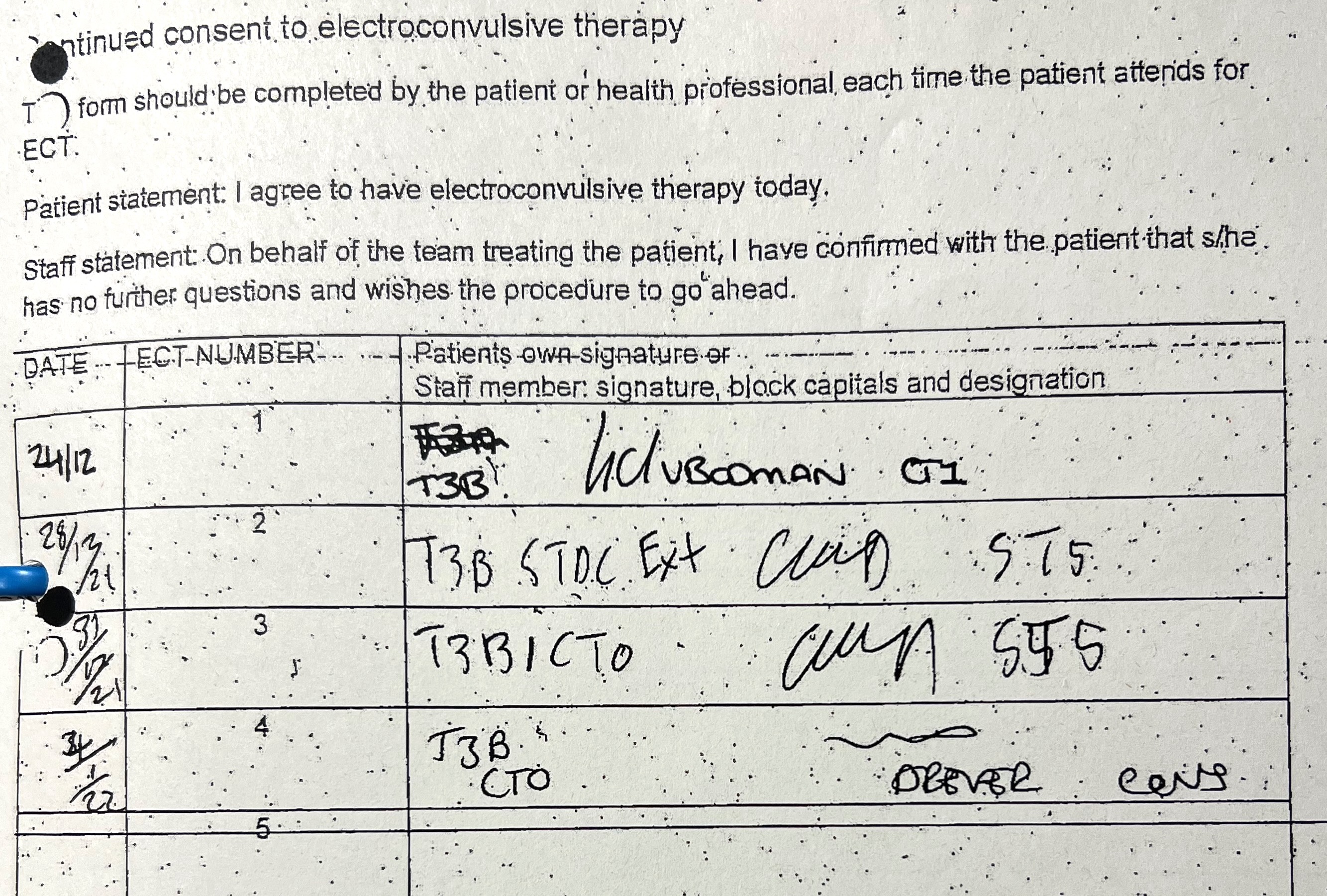This is the record of my consent to ECT. The earlier consent form is undated and is simply crossed through with 'Awaiting T3 [the form to notify the Mental Welfare Commission] H. Badial' written. This form contains very serious errors. 'T3B' is probably being used as shorthand for a form used to notify the Mental Welfare Commission for Scotland when the patient is Detained and resisting or objecting. I was not Detained for sessions 2, 3 and 4. The note to 'treatment' Number 2 says 'STDC Ext', which means an extension to the Short Term Detention Certificate. The letter that I received on 11th January 2022 confirms that no such certificate had been issued and I was an informal patient at the time and so could and would have refused treatment if I had known that. 'Treatments' 3 and 4 say 'CTO', which means Compulsory Treatment Order. No such order had been granted at the time of the treatments and the Tribunal hearing on 6th January 2022 rejected an application for a CTO, so as an informal patient I could and would have refused these treatments as well had I been told about my rights. 'CT1', 'ST5' and 'Cons' refer to the grade of doctor signing the form. The signature against the 4th 'treatment' appears to be that of Dr Leah Drever. It seems that the hospital acted illegally by inflicting the 'treatment' on me against my strongly expressed wishes and by ignoring my distress, as well as by not telling me what they were going to do to me until the morning of the first 'treatment'.