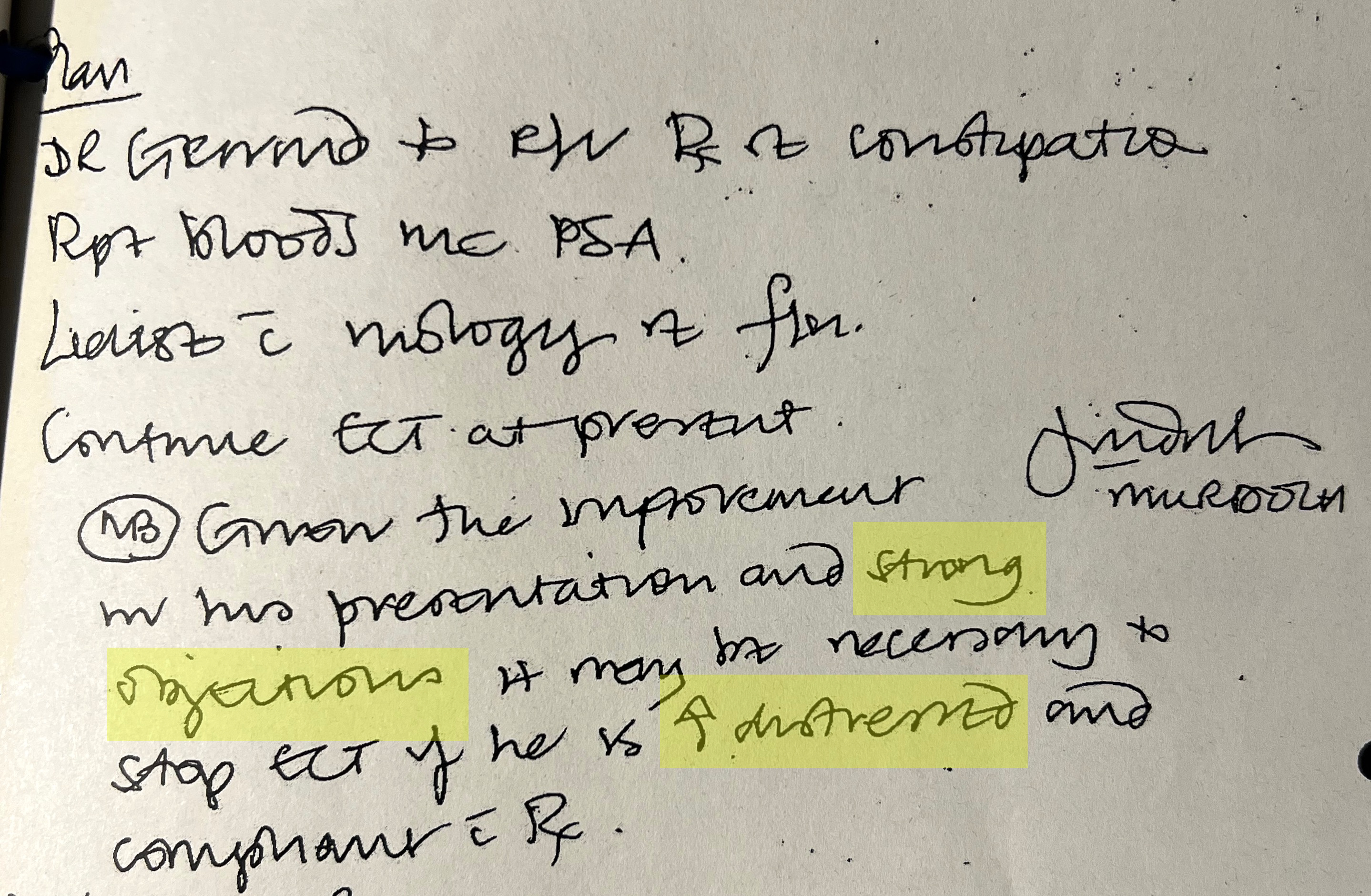 The extracts from my notes shown above prove that I continued to express my objection to forced electroconvulsive therapy but my objections were overruled. Dr Jane Murdoch used the term 'compliant', which shows that she did not treat me like a normal patient with a right to refuse treatment, as she should have done.