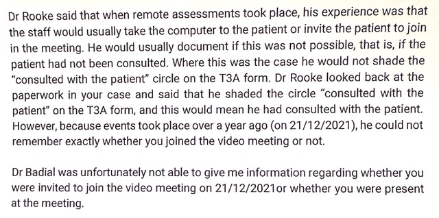 I made a complaint about Dr David Rooke to the Mental Welfare Commission for Scotland. He definitely did not consult me, as he was obliged to do, before authorising ECT, and no computer was taken to my bedside. My memory of that period was not obliterated by the ECT, and the note that Dr Hannah Badial made of the Microsoft Teams meeting with him did not record my presence or any consultation with me. However, it seems that Dr Rooke has some problems with his memory. The response from the MWCS is below.