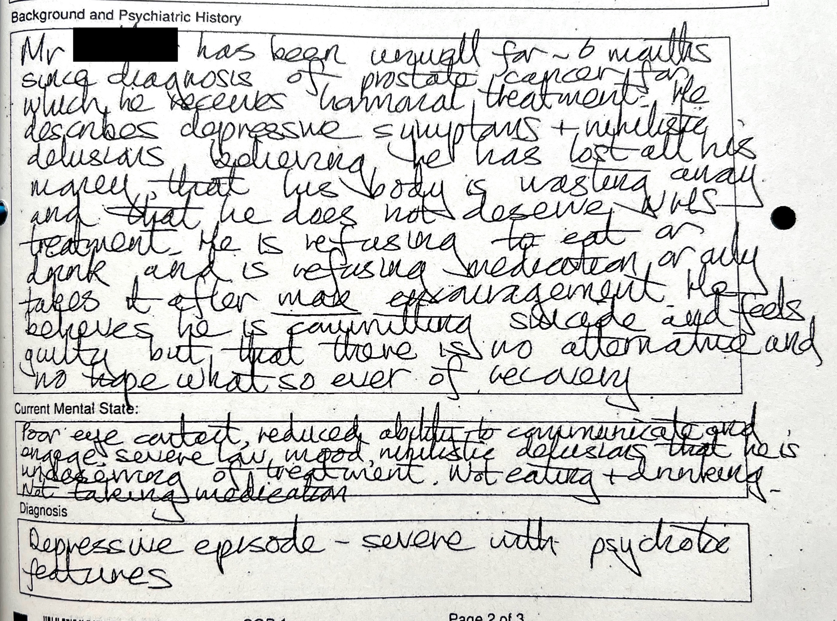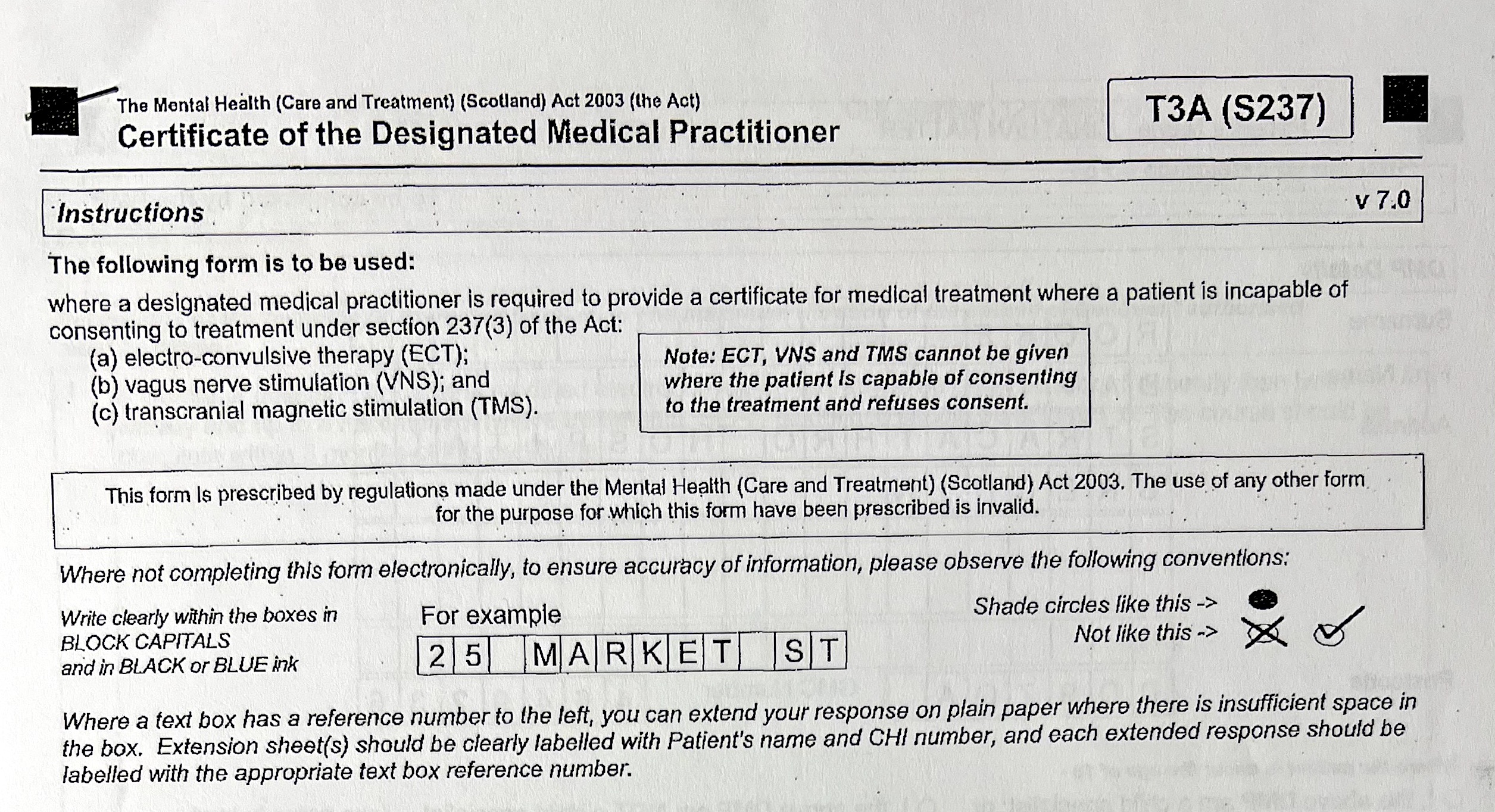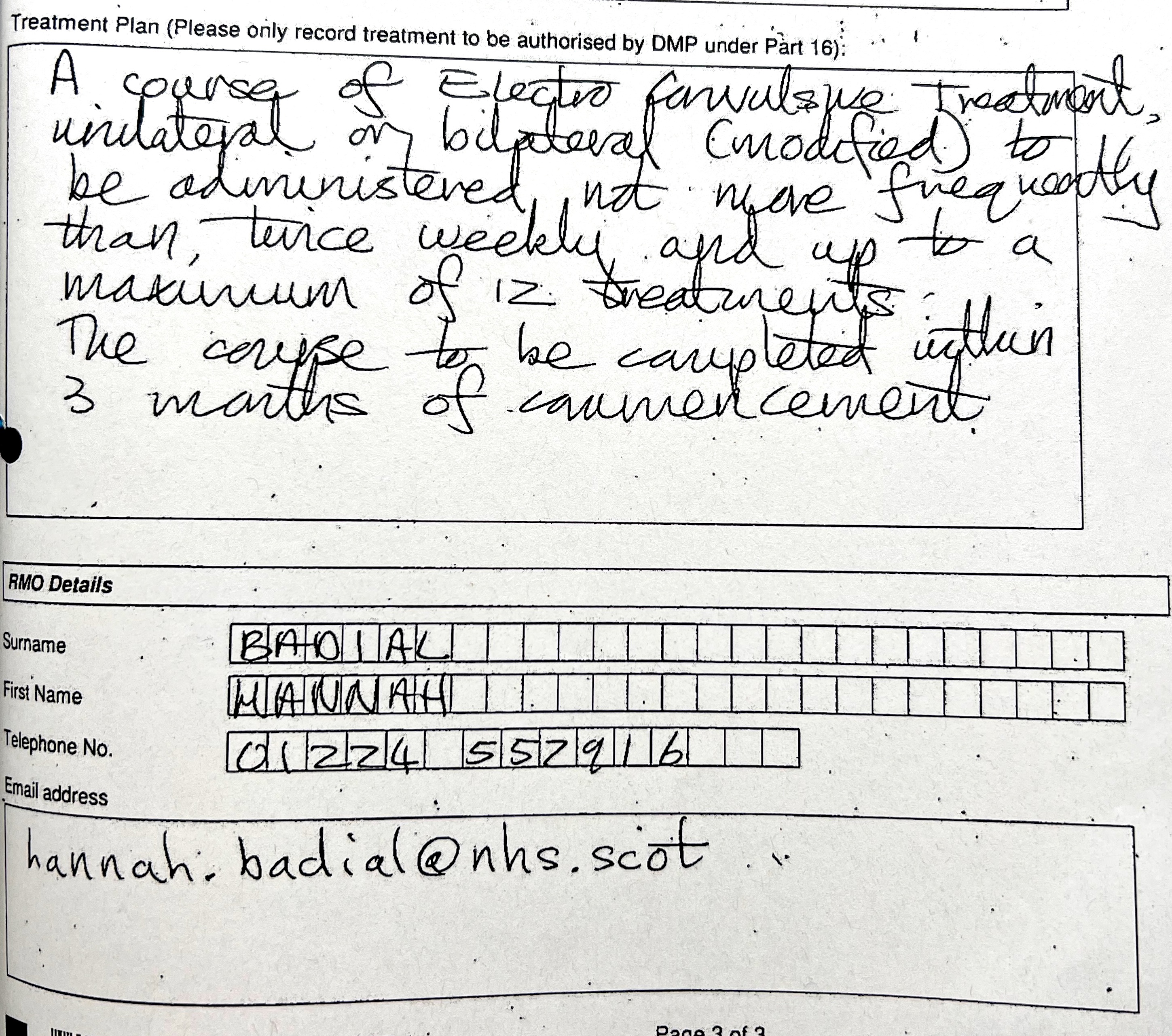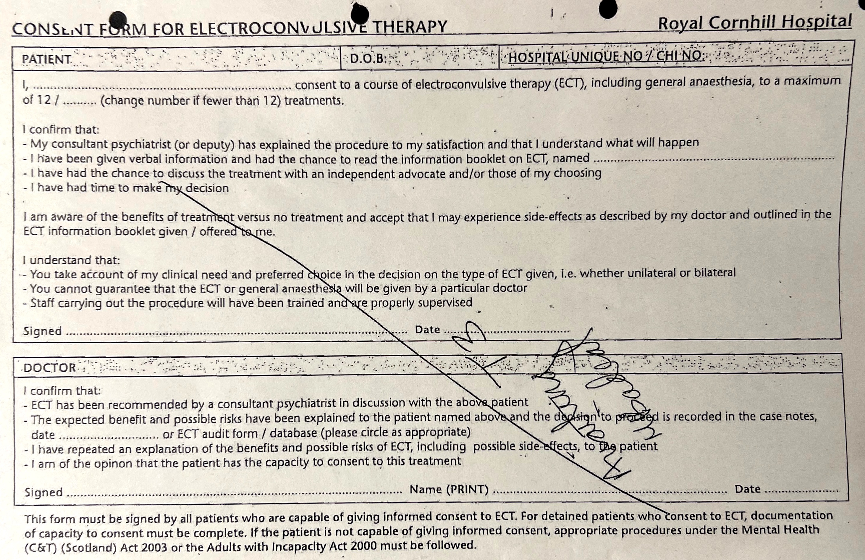 Dr Hannah Badial crossed through the consent form and wrote 'Awaiting T3'. The form (below) must be filled in by an independent medical practitioner appointed by the Mental Welfare Commission for Scotland. This was supposed to safeguard me by having a second opinion psychiatrist examine me. Note that the form states that ECT cannot be given when the patient is capable of consenting and refuses. I was certainly capable of consenting and did refuse as soon as I realised what was going to be done to me, but they decided that I lacked insight into my condition.