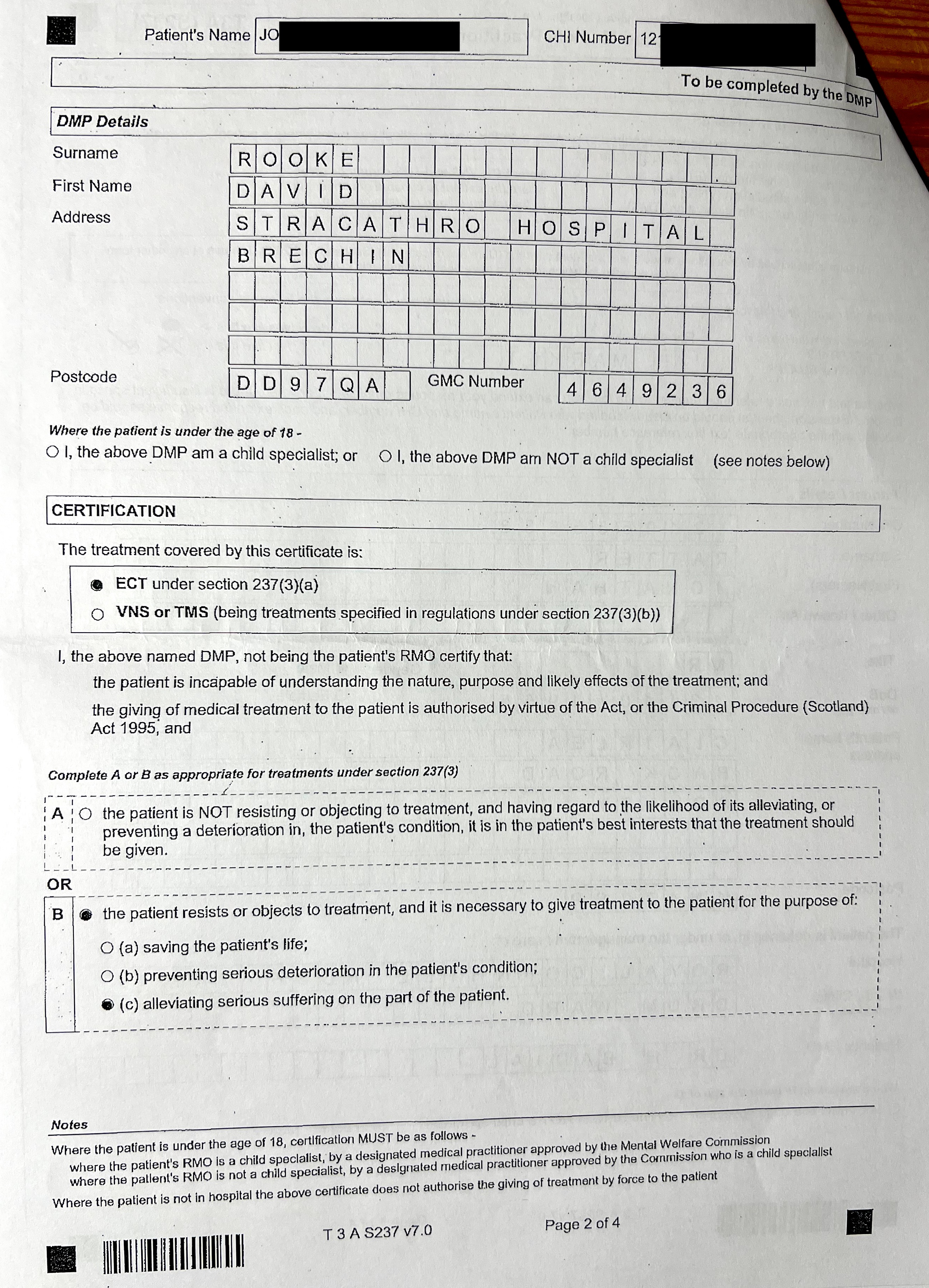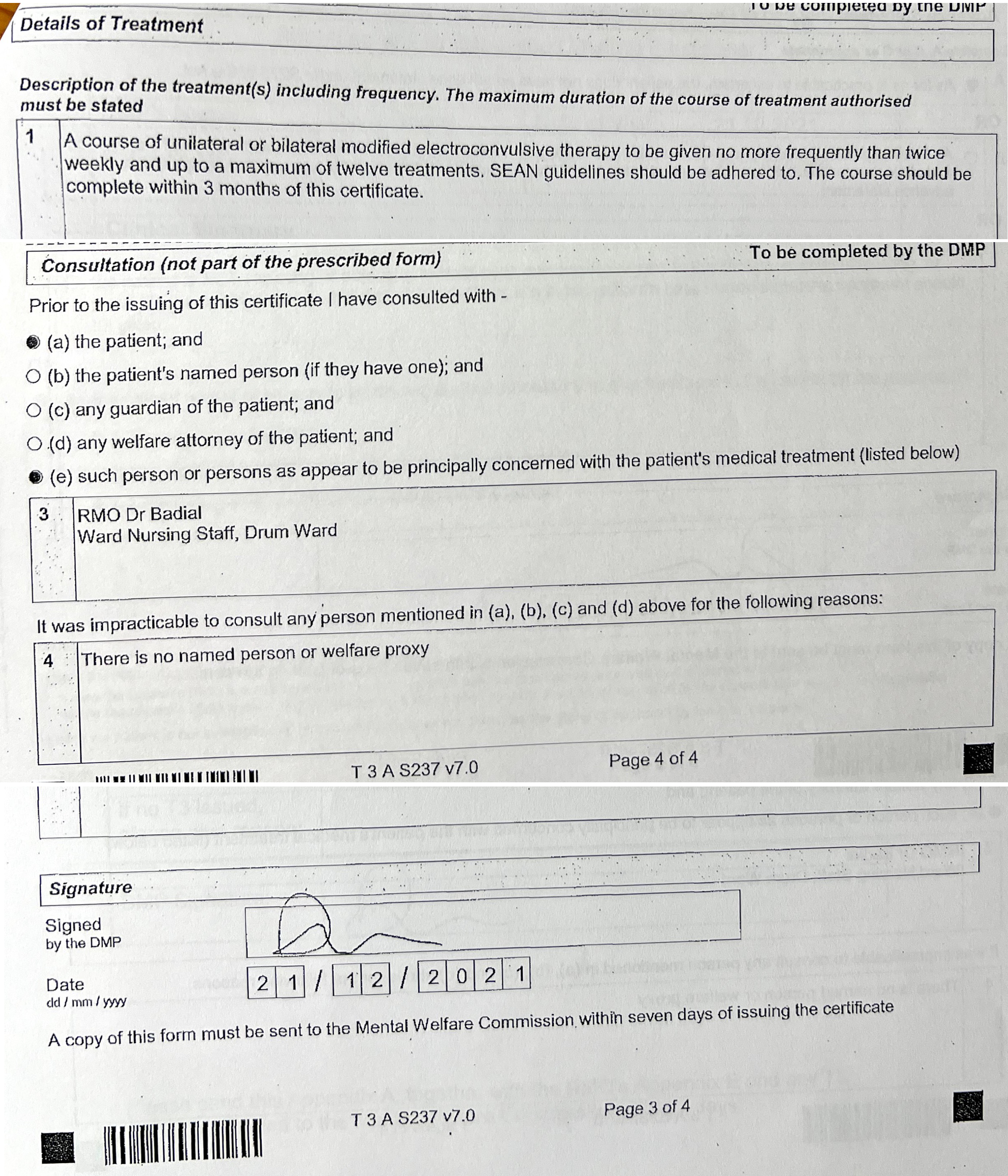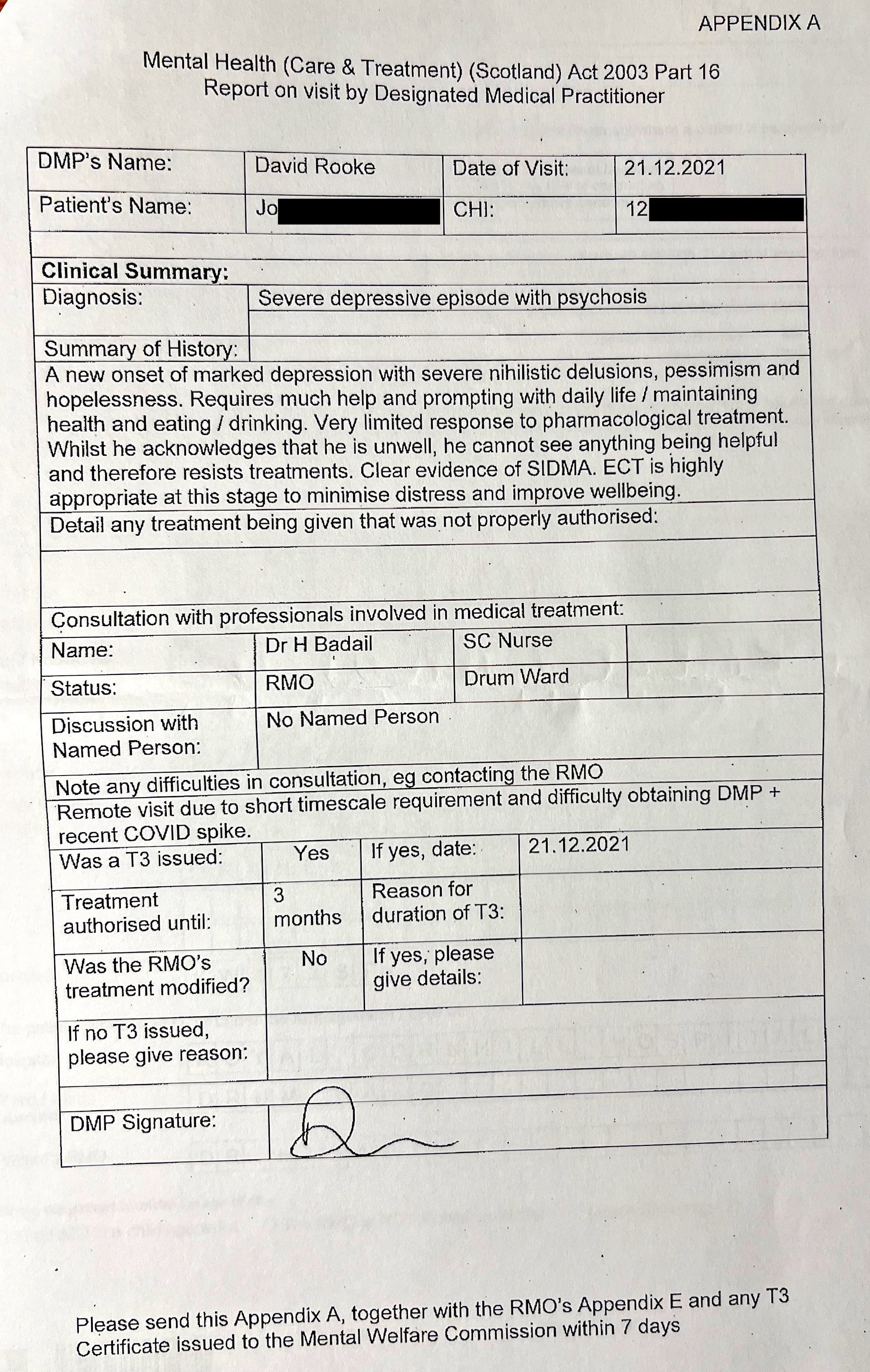 The most shocking revelation in the documents that I received from the Mental Welfare Commission for Scotland is the copy of Form T3A completed by the second opinion doctor, Dr David Rooke of Stracathro Hospital, Brechin. He held a Microsoft Teams meeting with Dr Hannah Badial and an un-named staff nurse on 21st December 2021, and despite never having met me or examined me, certified that I was incapable of understanding the nature, purpose and likely effects of the treatment, that treatment is authorised by virtue of the Act (when the Compulsory Treatment Order was due to expire and did expire 5 days later), that he had consulted with the patient when he hadn't, and that the patient resists or objects to treatment but that is is necessary for alleviating serious suffering on the part of the patient.
