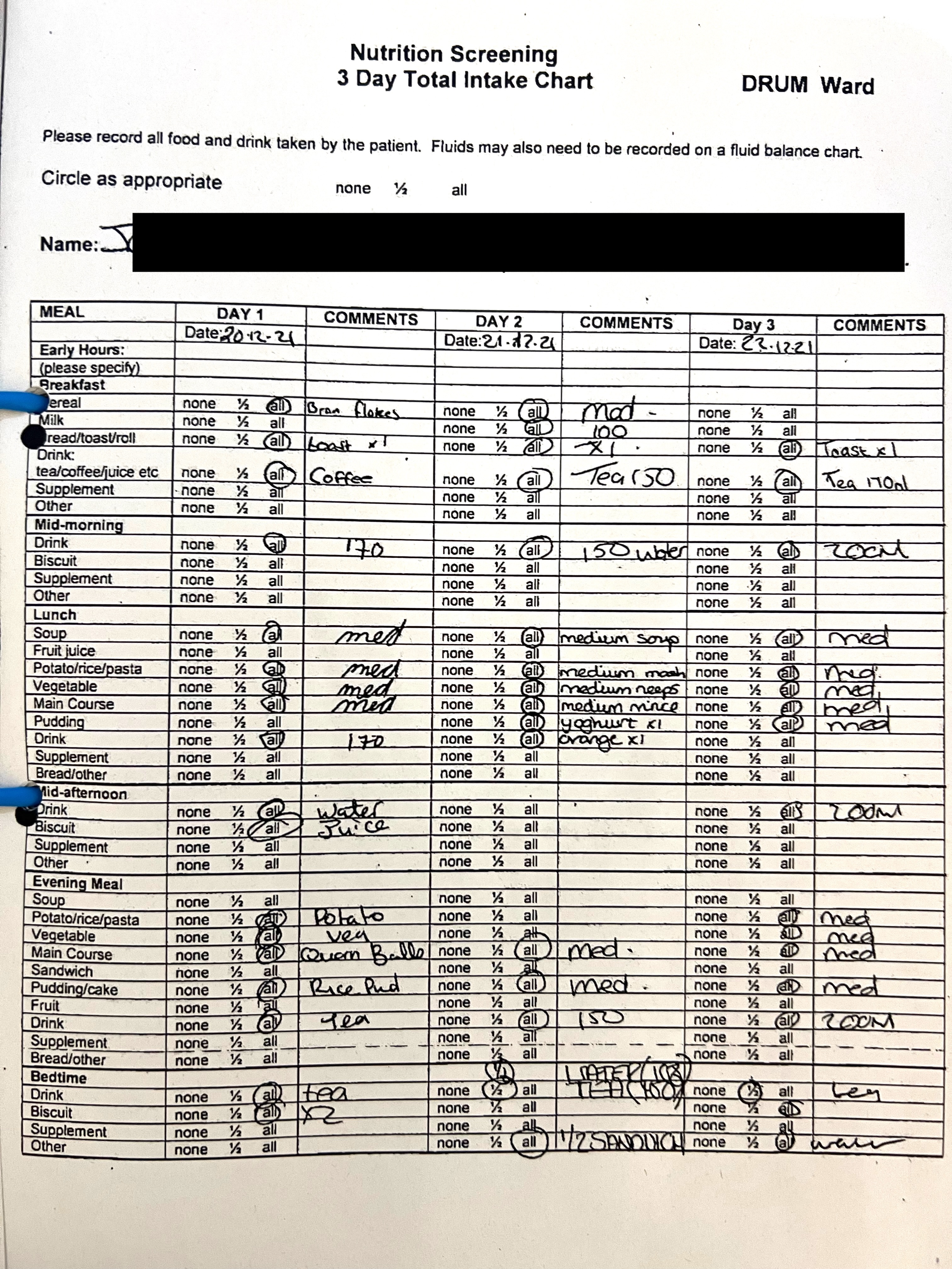 This is the record of my food intake on 21st December 2021, the day when Dr Badial met Dr Rooke on Teams and he signed Form T3A authorising ECT. It shows that far from being reluctant to eat and drink, I went and sat in the dining room with the other patients five times, ate all of my breakfast, had a 3-course lunch, an evening meal, and ate a sandwich before bedtime. I also took all the medication that was given to me.