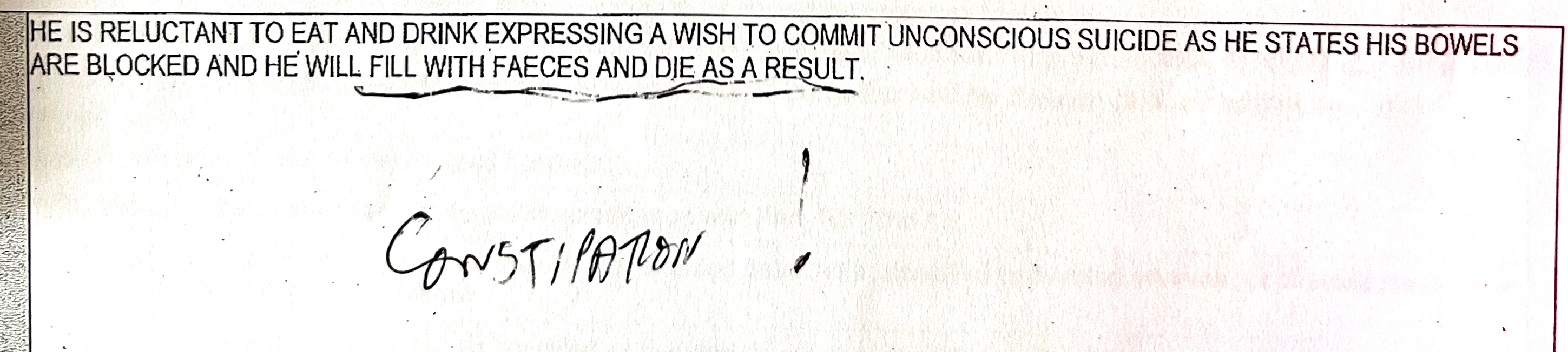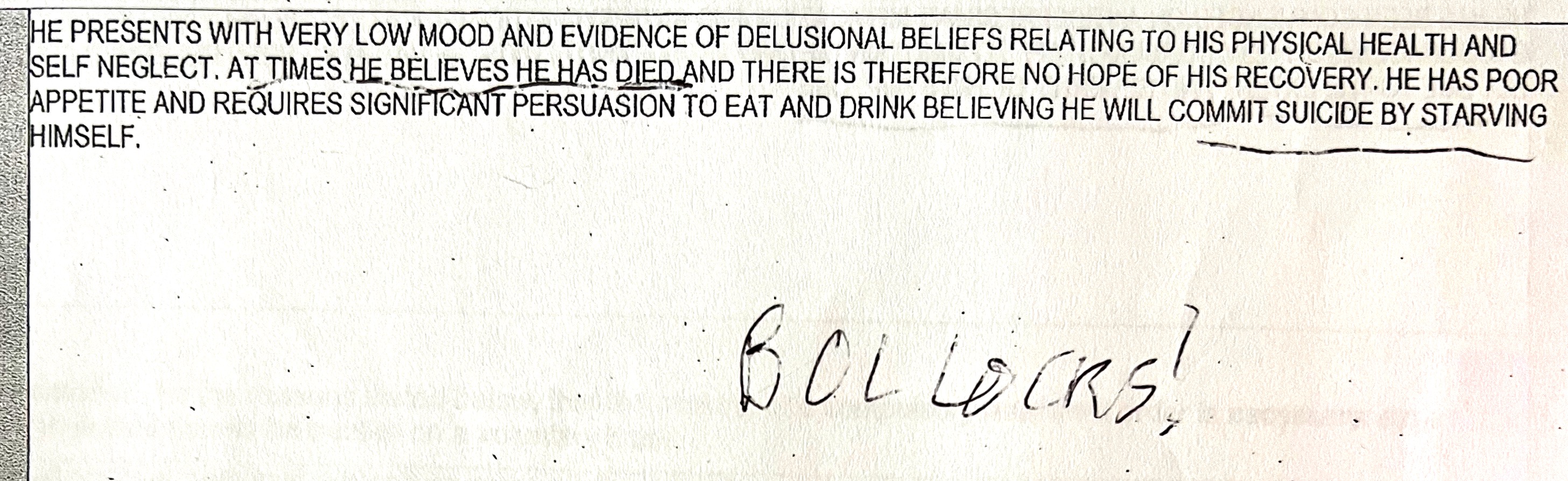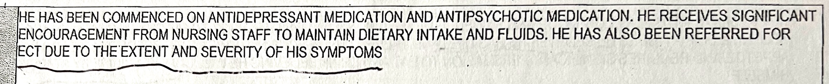 Above are extracts from Dr Jane Murdoch's submission to the Tribunal, written on 21st December 2021, with some annotations that I made when I went through her statement with my solicitor. Three days after Dr Murdoch certified that I was reluctant to eat and drink I was enjoying Christmas lunch and dinner with the other patients, and eight days after she stated that I was unable to arrange representation I had a meeting with my solicitor. My dietary intake is recorded in my notes, and on the day that she said that I needed encouragement to eat I ate breakfast, had a morning drink, then a 3-course lunch, an afternoon drink, a 2-course evening meal, and a sandwich before bed. The improvement over the Christmas period cannot be attributed to the first session of forced ECT on 24th December, as I now know from seeing my notes that the increasing currents that they passed through my brain on that occasion failed to produce a seizure.