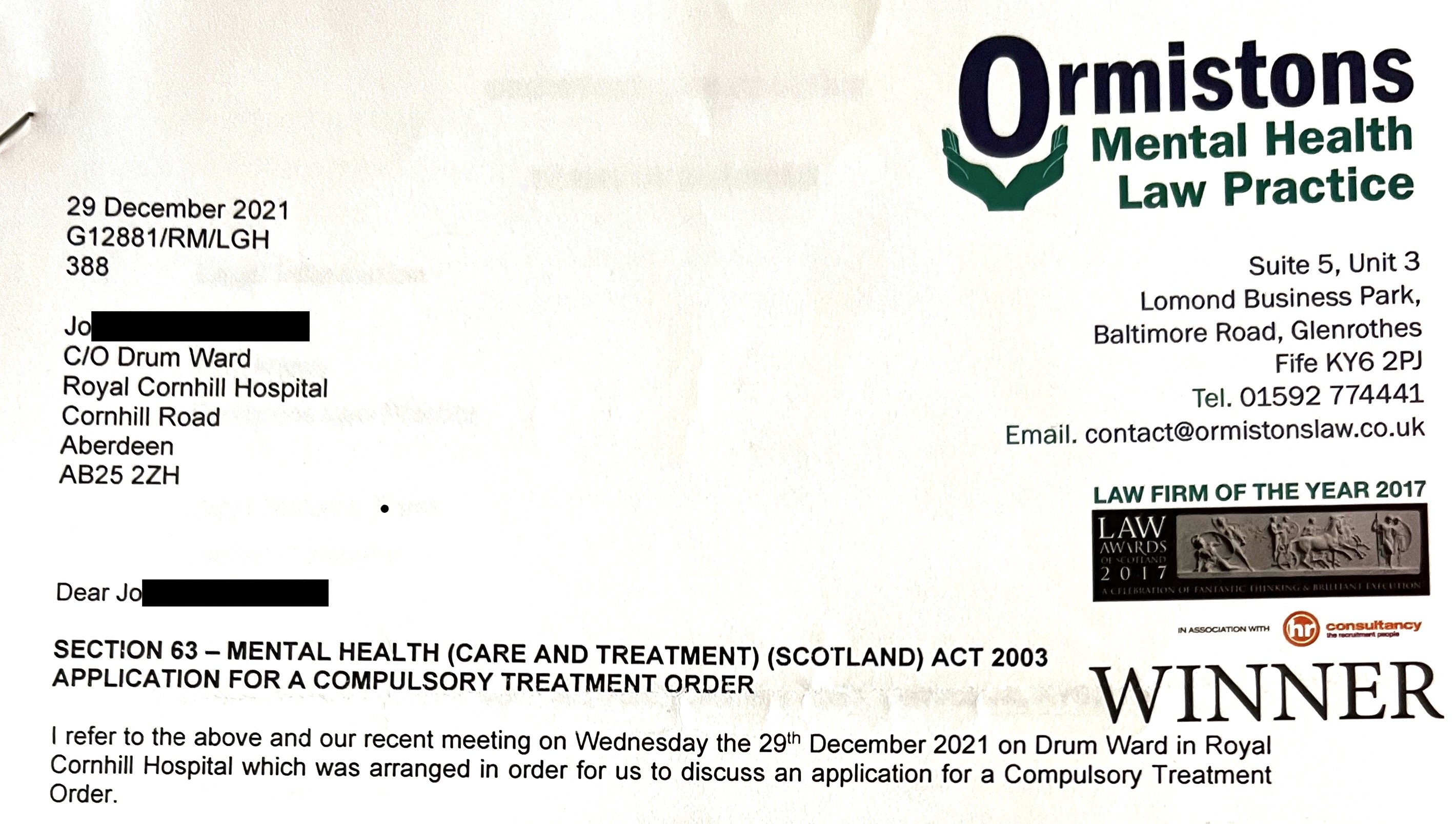 Above are extracts from the statement that Dr Rauinder Badial, the husband of Dr Hannah Badial, submitted to the Tribunal as the second-opinion psychiatrist. It is dated 22nd December 2021. He only met me once. Despite both psychiatrists testifying that I was incapable of instructing a solicitor and incapable of making decisions about my own treatment, the Advocacy service arranged for a solicitor from Ormistons Mental Health Law Practice to represent me at the Tribunal. I met him for the first time on 29th December 2021 and we met again on 5th January 2022 to go through the Compulsory Treatment Order Pack that had been submitted to the Mental Health Tribunal for Scotland.